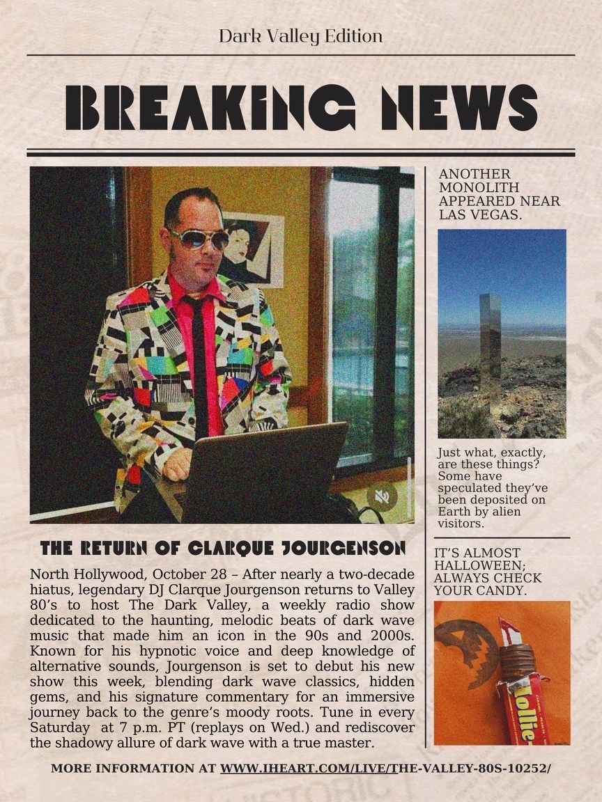 So now he’s back on TV80’s playing the darkest and most "tragic" Alternative 80's music. His new show “Dark Valley” airing Saturday nights from 7p -10p and running again on the following Wednesday night from 9p-12am.